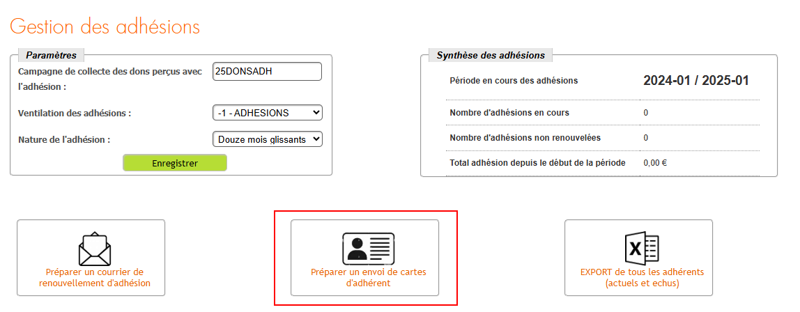 Dans un premier temps, il sera nécessaire de lotifier l'envoi des cartes, c'est-à-dire regrouper en un lot tous les dons d'adhésion n'ayant pas donner lieu à l'envoi de la carte. C'est ce que gère la fonction "Préparer un envoi de cartes d'adhérents" présente sur la page d'accueil des adhésions :