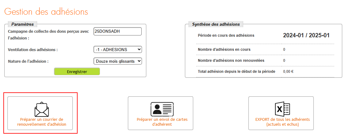 L'appel à la fonction de renouvellement se fait à partir de la page d'accueil des adhésions, ici :