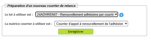 Quelle que soit la fréquence des campagnes de renouvellement choisie par l'association, la fonction de génération des courriers a besoin de connaître le lot de sortie réservé à l'envoi de courriers et de la matrice à utiliser pour générer le PDF à imprimer.