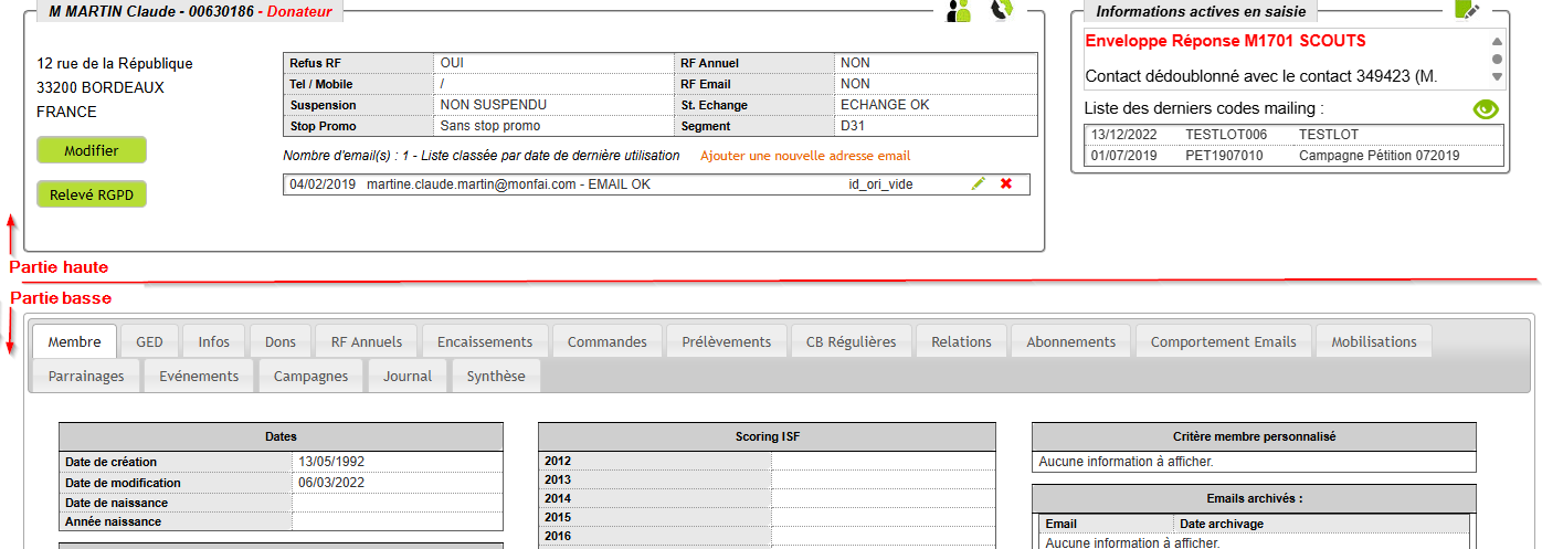 Cette partie supérieure est celle qui apparaîtra en haut de chacune des fonctions de saisie liées à ce membre comme la saisie d'un don ou d'une commande, la création d'un prélèvement automatique et l'enregistrement d'une carte bancaire récurrente.
