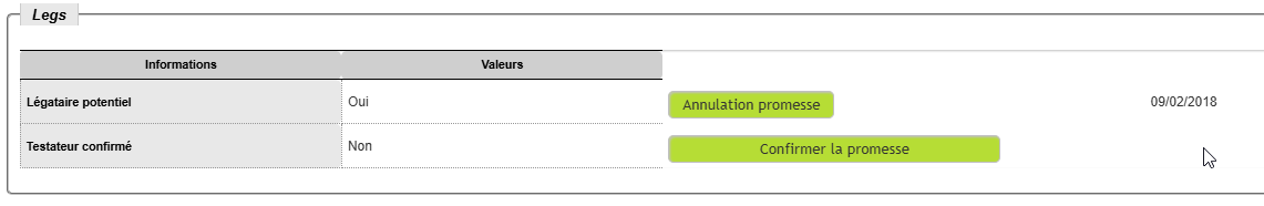 Plus tard, lorsque vous recevrez les actes officiels mentionnant votre association comme légataire, vous pourrez valider la deuxième étape en cliquant sur le bouton "Confirmer la promesse". La date de cette action sera elle aussi automatiquement enregistrée.