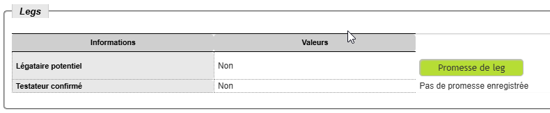 - un mémo "informations legs" qui permet d'enregistrer l'ensemble des informations que vous a communiqué le membre à propos de son intention ou de l'enclenchement de la procédure de legs,