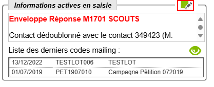 Par défaut, sous le bloc notes, la liste des dernières campagnes reçues par le membre s'affiche classée dans l'ordre ante-chronologique, la dernière reçue étant en première position. Cette liste de campagnes vous permet d'imputer un don reçu sans code à la dernière campagne reçue.