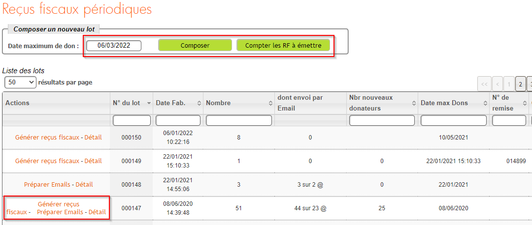 Un numéro unique est ensuite attribué à chacun des dons concernés. Tous ces numéros différents sont regroupés dans un numéro de lot de RF. C’est ce numéro qui servira de référence lors de l’édition des RF.