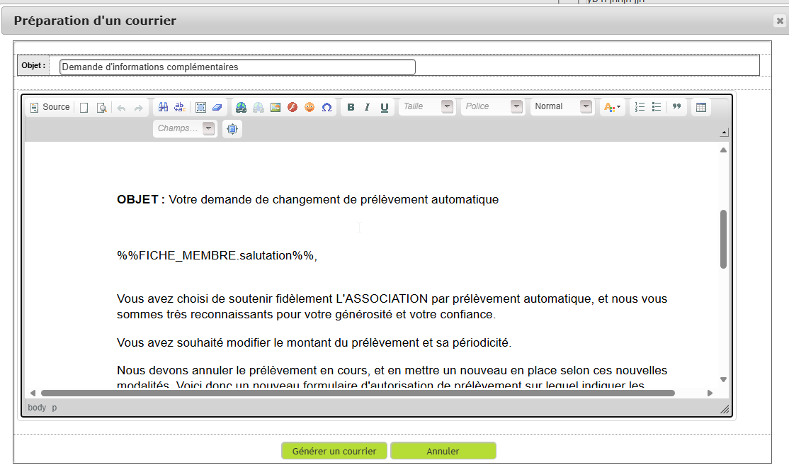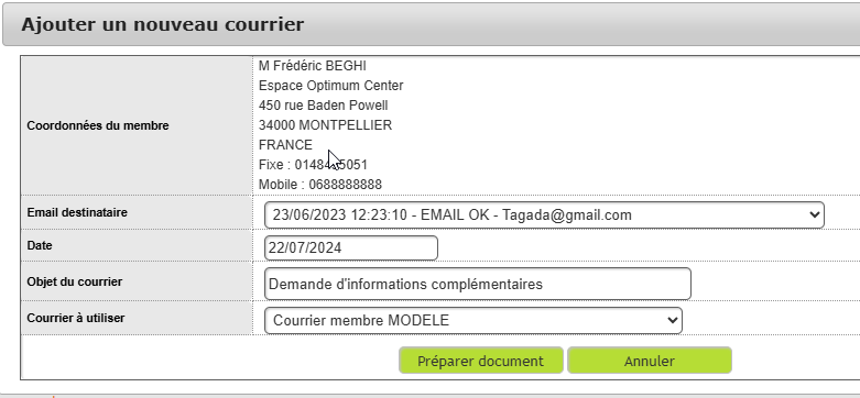 Une fois les modifications terminées, cliquez sur le bouton « Générer un courrier » pour fabriquer le fichier PDF correspondant à ce courrier et le stocker dans la GED du membre.
