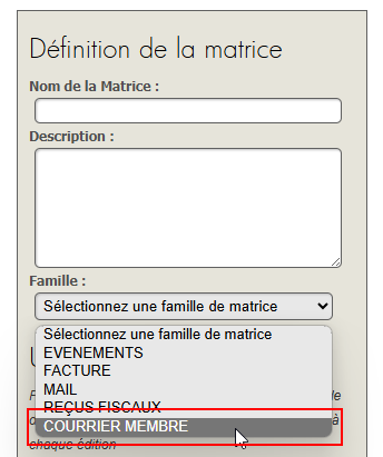 Créez une matrice en prenant soin de lui affecter la famille « Courrier Membre ». C'est cette affectation qui la rendra disponible dans la GED du membre.